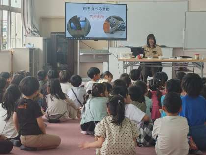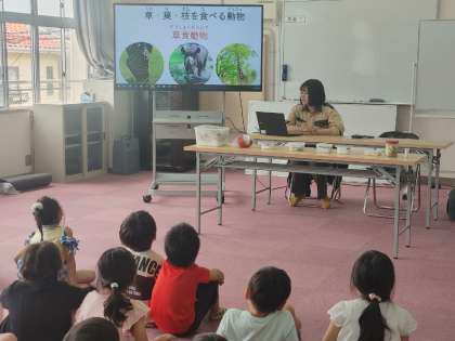 動物によってえさが違うこと、食べさせる順番があること、ふんの秘密などを映像を使ってわかりやすく教えていただきました。