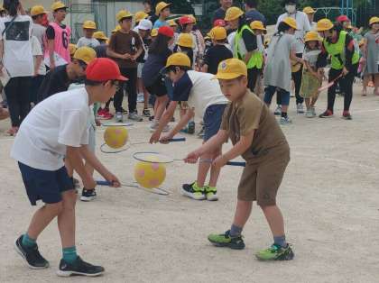 ハンバーグに見立てたボールをパンに見立てたラケットで挟みます。