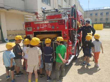 消防車見学、新聞紙スリッパ作り、VR体験、水消化器、煙テント、起震車体験、DVD視聴、心肺蘇生法、警察講話など、工夫されたプログラムばかりです。