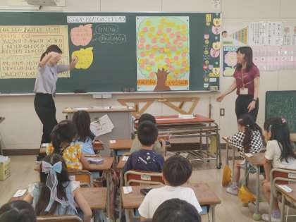次に、隣の友達の良い所さがしをして赤いリンゴカードに、自分の良い所さがしをして黄色いリンゴカードに記入します。