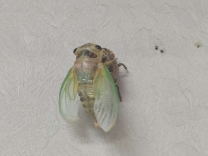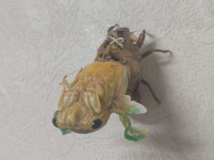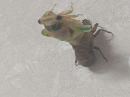 校長室の壁に登って羽化を始めました。背中が割れて頭が出てきました。6本の脚を引き抜いて、重力を使って逆さまにぶら下がります。