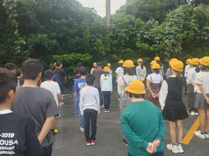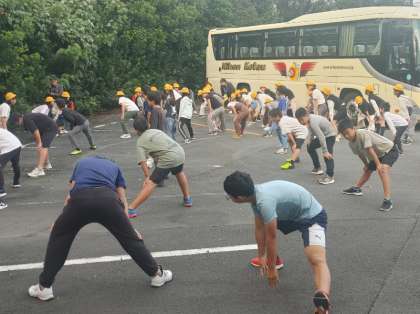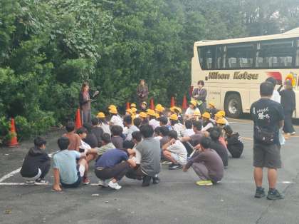 眠い目をこすって、宿舎前の駐車場で朝の集いが始まりました。