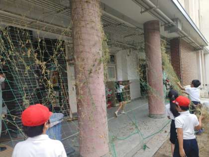 玄関の鯉池の前に設置された緑のカーテンの後片付けをしました。