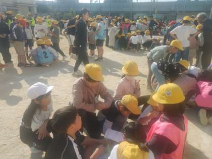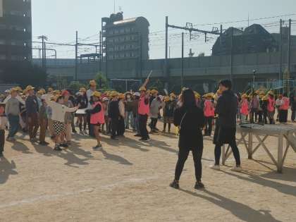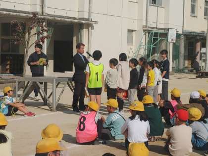 運動場でふれあい遠足の表彰式がありました。
