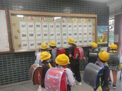 朝、登校してたくさんの児童が掲示板に集まりました。