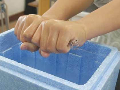 試験管の口にシャボン玉液をつけ、お湯で温めた手で試験管を握ります。