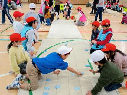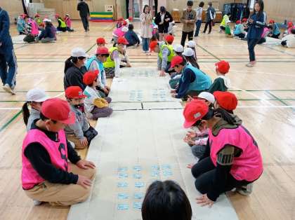 6年生にリードされ、1年生もカルタ取りを楽しんでいました。