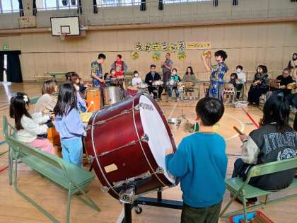 講堂にたくさんの学校にある打楽器を円にして並べ、熱狂のアンサンブルが展開されました。
