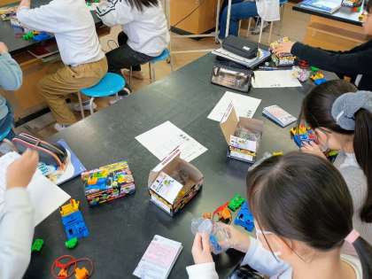 モーターにつけたプロペラの回る様子をしらべたり、豆電球や発光ダイオードの光る様子や、電子ブザーの鳴る様子を調べたりしました。