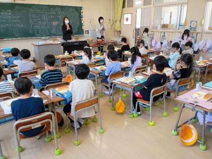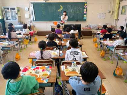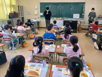 献立は、カレースープスパゲッティ、かぼちゃのマリネやき、ミニフィッシュ、いちごジャム、パン、牛乳です。