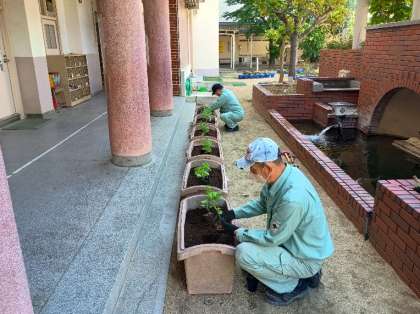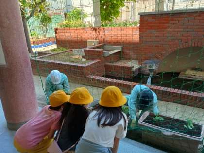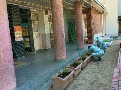 管理作業員さんが、網状のネットを天井から吊るし、ブランターにゴーヤの苗を植えました。