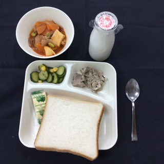 鶏肉のバジル焼き ケチャップ煮 きゅうりとコーンのサラダ パン 牛乳