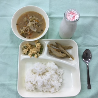 きびなごてんぷら みそ汁 エンドウの卵とじ ごはん 牛乳