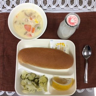 コーンクリームシチュー グリーンサラダ かわちばんかん パン ママレード 牛乳
