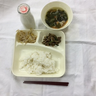 プルコギ 豆腐のスープ 甘酢和え ごはん 牛乳