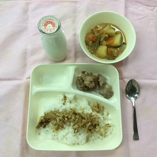 鶏肉の山椒焼き ジャガイモと厚揚げのみそ煮 ごまかかいためごはん 牛乳