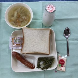 ウインナーのケチャップソース スープ ジャガイモとさんどまめのサラダ マヨネーズ パン 牛乳 アプリコットジャム