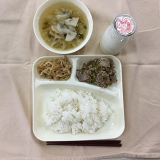 豚肉のうめ風味 すまし汁 切り干し大根の炒め煮 ごはん 牛乳