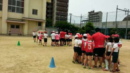 その後、チーム対抗でボールをパスしたり、レッドハリケーンズの方の間を通り抜けるゲームをしたりしました。