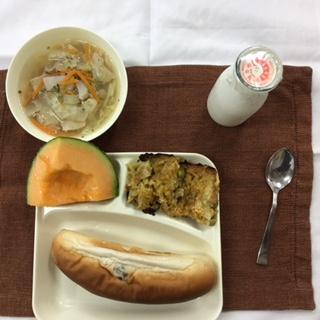 カレードリア キャベツのスープ クインシーメロン パン 牛乳