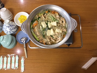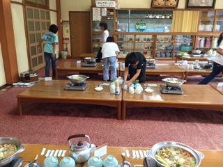 夕食のしたくが始まりました。食事係はもう慣れたもので、要領よく準備を始めています。今夜の献立は、鶏鍋です。