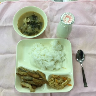 いわし天ぷら みそ汁 切り干し大根の炒め煮 ごはん 牛乳