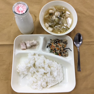 鮭のしょうゆ風味焼き 五目汁 高野豆腐の炒り煮 ごはん 牛乳