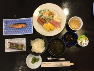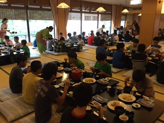 朝食の時間です。温かい味噌汁、焼き魚、サラダに卵焼き、今日の活動に備えて、しっかりといただきます。「ここでいただく食事もこれが最後です。作っていただいた人に感謝してしっかり食べましょう。」「鳥羽水族館での活動で体調を崩さないように、しっかり食べましょう」と言いました。