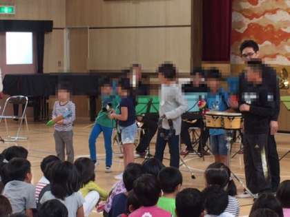 ギロ、アゴゴベル、マラカス、ボンゴなどのリズム楽器の演奏に挑戦。6年生も元気よく「やりたい」と挙手し、最後はじゃんけんで代表を決めました。