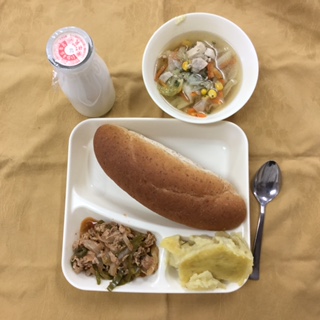豚肉と野菜のケチャップソテー スープ スイートポテト ライムギパン 牛乳