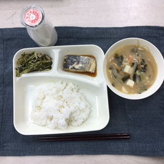 さごしのしょうゆだれかけ みそ汁 水菜の煮びたし ごはん 牛乳