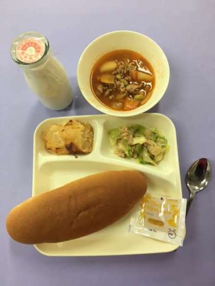 ふだ肉と野菜のケチャップ煮、ツナとキャベツのソテー、もものクラフティ、マーマレードジャム、パン、牛乳