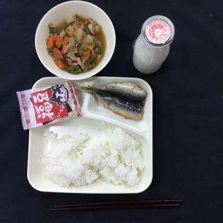 イワシのしょうがじょうゆかけ 含め煮 いり大豆 ごはん 牛乳