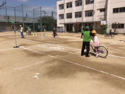 あたたかい日差しの中、運動場に作った模擬道路で、自転車の安全な乗り方を勉強しました。