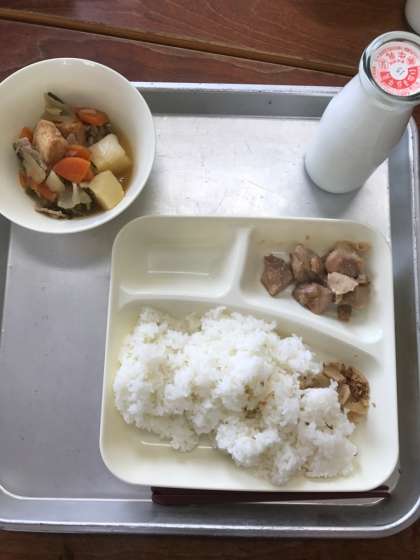 鶏肉の照り焼き、じゃがいもとあつあげの煮物、ごまかかいため、ご飯、牛乳