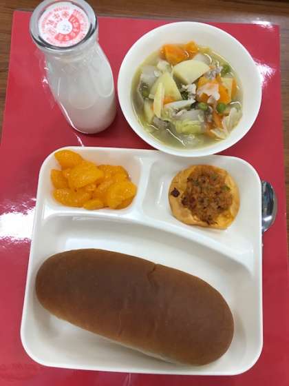 豚肉と野菜のスープ煮、かわりピザ、みかんのかんづめ、黒糖パン、牛乳