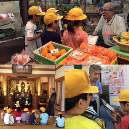 6月2日、2年生は生活科の学習で、北田辺の町をたんけんしました。お店や保育所、幼稚園、交番、消防署、ディサービス、お寺をグループに分かれて訪れました。