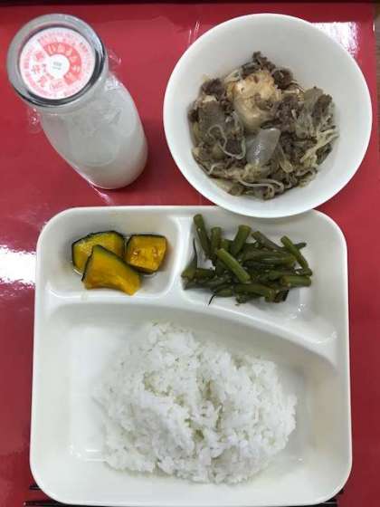 すきやき煮、三度豆のごまずあえ、焼きかぼちゃのあまみつかけ、ご飯、牛乳