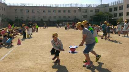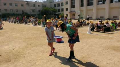 今年度初めての運動場でのゲーム集会は、[ハンバーガーゲーム]。バドミントンのラケットにボールをはさみ、ふれあい班でリレーするゲームです。