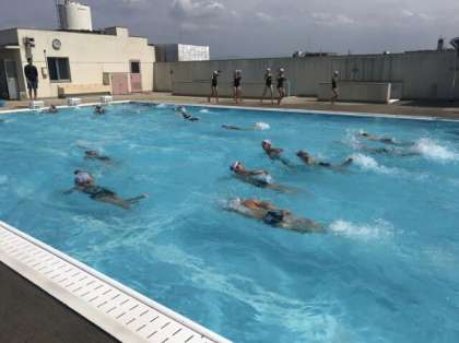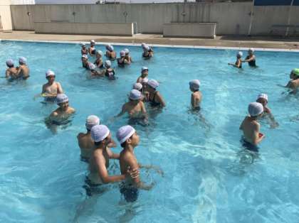ポニョの曲で水なれをした後、けのび、イルカジャンプ、クロール、平泳ぎでウォーミングアップ。