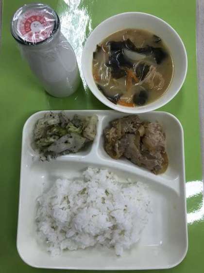 鶏肉の甘辛焼き、味噌汁、キャベツの赤じそあえ、ご飯、牛乳