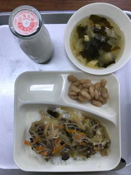 牛丼、すまし汁、大福豆の煮物、牛乳