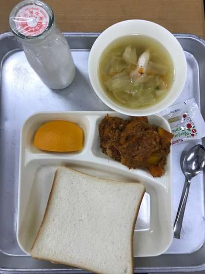 かぼちゃのミートグラタン、スープ、オレンジ、りんごジャム、食パン、牛乳