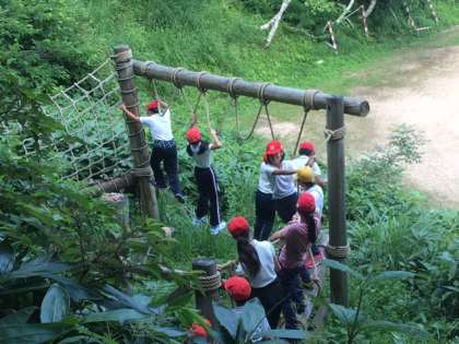 森の中の20個のアスレチックに挑戦しました。跳んだり、登ったり、くぐったり、グループで協力して、ゴールまで頑張りました。