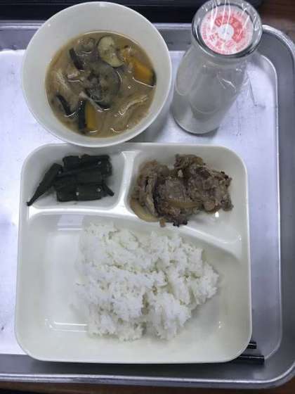 豚肉の甘辛焼き、味噌汁、オクラのおかかいため、ごはん、牛乳