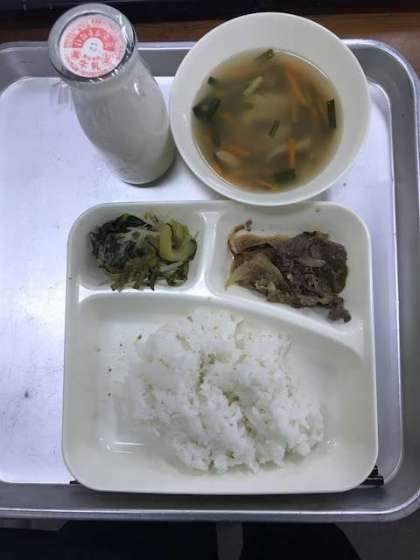 プルゴギ、トック、チンゲンサイともやしの甘酢和え、ごはん、牛乳