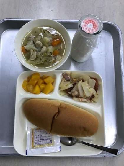 鶏肉とテボ豆のスープ煮、じゃがいもとトマトのチーズ焼き、黄桃、パン、ジャム