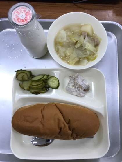 鶏肉のマリネ焼き、スープ煮、きゅうりのピクルス、パン、牛乳