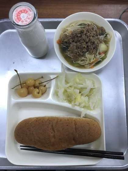 坦々麺、キャベツの甘酢漬け、さくらんぼの缶詰め、ライ麦パン、牛乳
