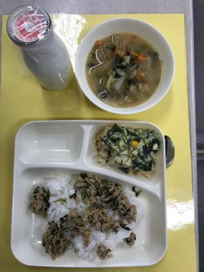 千草焼き、味噌汁、ツナっ葉炒め、ごはん、牛乳